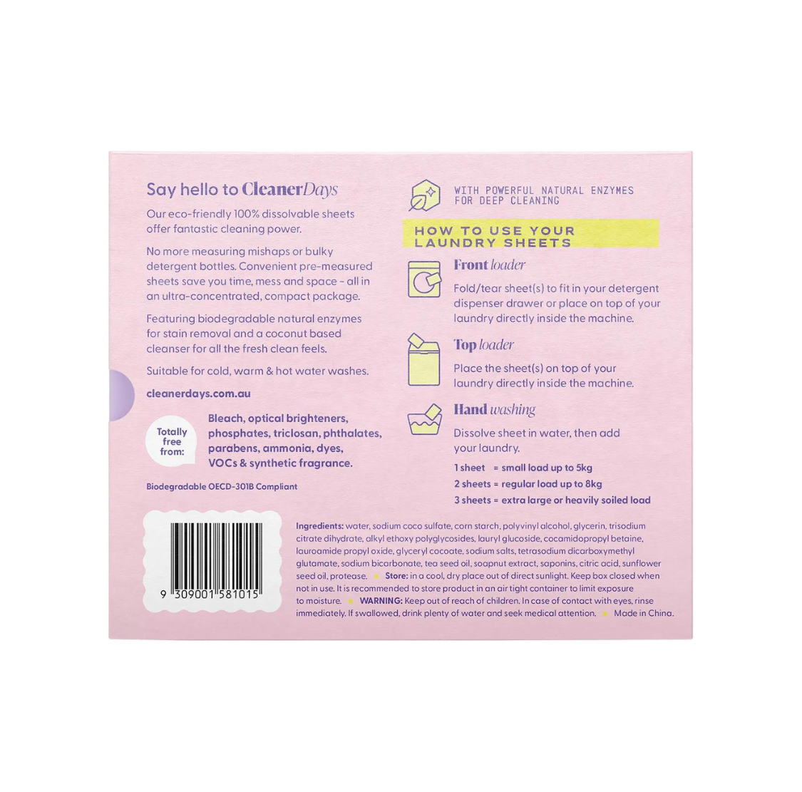 Water, Sodium Coco Sulfate, Corn Starch, Polyvinyl Alcohol, Glycerin, Trisodium Citrate Dihydrate, Alkyl Ethoxy Polyglycosides, Lauryl Glucoside, Cocamidopropyl Betaine, Lauroamide Propyl Oxide, Glyceryl Cocoate, Sodium Salts, Tetrasodium Dicarboxymethyl Glutamate, Sodium Bicarbonate, Tea Seed Oil, Soapnut Extract, Saponins, Citric Acid, Sunflower Seed Oil, Protease.