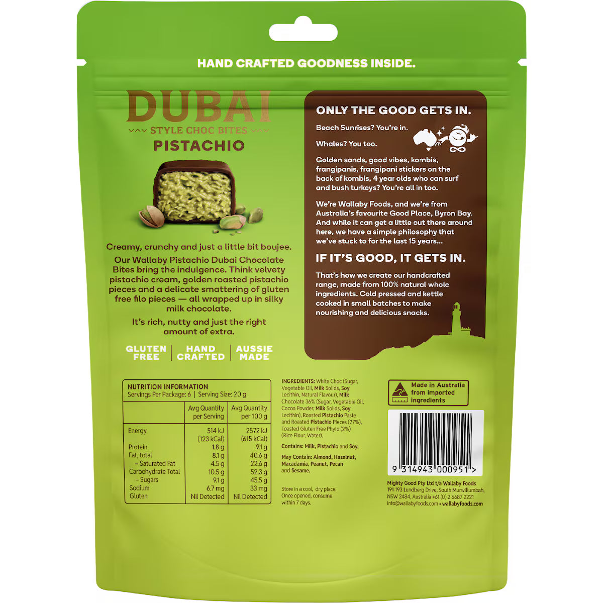 White Choc (Sugar, Vegetable Oil, Milk Solids, Soy Lecithin, Natural Flavour), Milk Chocolate 36% (Sugar, Vegetable Oil, Cocoa Powder, Milk Solids, Soy Lecithin), Roasted Pistachio Paste and Roasted PIstachio Pieces (27%), Toasted Gluten Free Filo and Coconut (2%) (Rice Flour, Water).